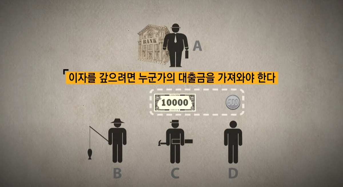그래서 은행은 다시 500원을 찍어내 D라는 사람에게 연이율 5%의 이자를 갚는 조건으로 500원을 빌려준다. 그래서 B는 D에게 물고기를 팔아 500원을 번다. 그리고 은행에 이자 5%인 500원과 함께 1만 500원을 갚는다. 하지만 D는 500원의 연이율 5%인 25원을 원금과 함께 상환해야 하지만 시중에 돈이 없다.
